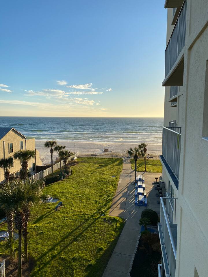 **Recently Renovated** This beach condo is a spacious 3/2 - The deck is east facing with beautiful sunrise views from the 5th floor. A Tiki hut with food and beverage services, full gym, jacuzzi, two pools (one heated) & Kiddie Pool :) Primary guest must be 23 years or older(please inquire if not). Private WiFi for guest privacy We have 5 total beds- king, queen, 2 fulls, and queen couch bed in living room **Temporary construction on walkways at resort November 28-Dec 12th. Noise present**